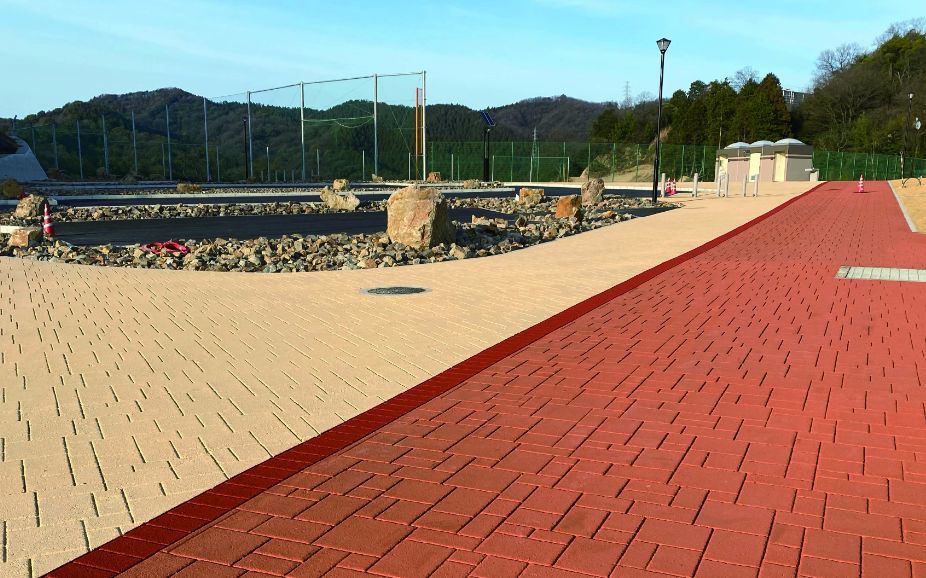 アースタンプは、型押しパネルで成形し、色を吹き付け、味気なかった黒色のアスファルト舗装を石畳やレンガ調の景観舗装に仕上げる新工法です。